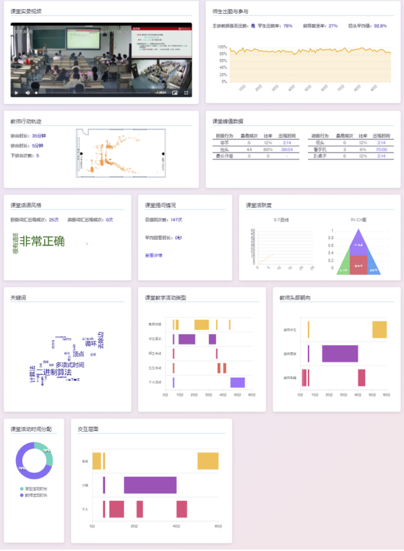 伴随式采集实训教学过程中生成的多模态数据,利用人工智能技术,自动提取课堂教与学的相关特征,从不同的维度揭示课堂黑箱,实现常态化的课堂教学智能分析与反馈。支持对基本授课技能、课堂问答技能、教学设计技能和数字化教学技能四大维度下的31个技能点进行过程性诊断与反馈,可辅助师范生明晰各技能要素的掌握情况,更加有针对性地改进提升。