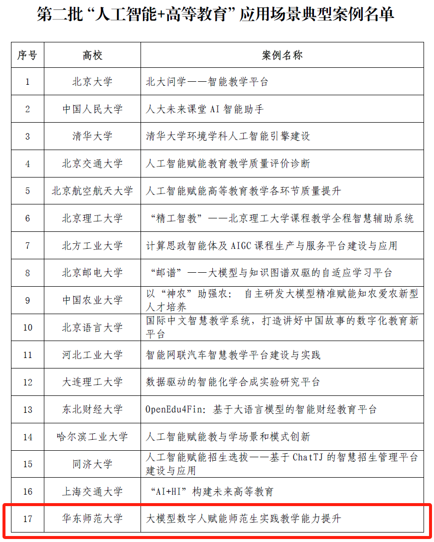 为深入贯彻落实习近平总书记在全国教育大会上关于“注重运用人工智能助力教育变革”的重要指示精神,积极响应国家关于加快教育现代化、建设教育强国的战略部署,教育部高等教育司近期组织开展了第二批“人工智能+高等教育”应用场景典型案例的征集、论证与推荐工作,旨在进一步发掘一批在人工智能技术应用方面具有引领性、创新性,且对高等教育改革与发展具有显著推动作用的实践案例。经高校申报、专家论证等环节,确定了第二批32个“人工智能+高等教育”应用场景典型案例。