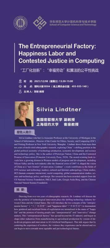 Drawing from over ten years of ethnographic research, Dr. Lindtner will discuss the role the promise of technological innovation plays the shifting technology industry between China and the United States. She will introduce the two concepts of the entrepreneurial factory (“工厂化创新”) and happiness labor (“幸福劳动”) to demonstrate how gendered and racialized forms of exploitation are normalized in the name of happy life and the promise of turning people into entrepreneurial and innovative change makers. This entrepreneurial factory has spread beyond the IT industry and begun to shape other industries from manufacturing to agricultural production by visions of data-driven progress and innovation in AI (Artificial Intelligence). This talk argues that by centering the experience of workers, the violence they experience can be altered and we can begin to move towards more equitable and just technological futures.