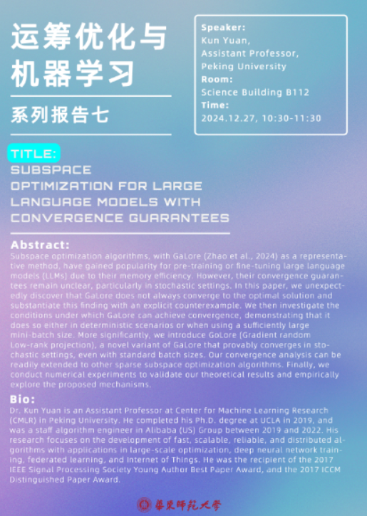 报告题目:Subspace Optimization for Large Language Models with Convergence Guarantees