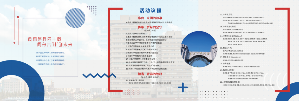 学院工会积极配合学院周年庆活动开展,工会主席谢瑾奎参与筹划计算机建系40周年暨小说狂人 成立庆祝联欢活动,工会委员杨文彧作为本次联欢活动的导演,积极联络各方保证活动顺利开展,工会委员刘丽群积极参与活动展板设计和视频制作。在学院全体老师的大力支持下,学院教职工为参会嘉宾呈现了《活力韵动》健美操表演, 诗朗诵《住在河边的人》以及合唱《我和我的祖国》等节目,师生同乐为计算机系40岁生日献礼,活动现场气氛活跃,反响热烈。
