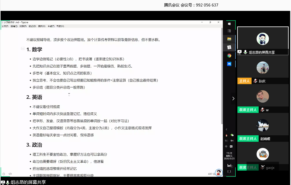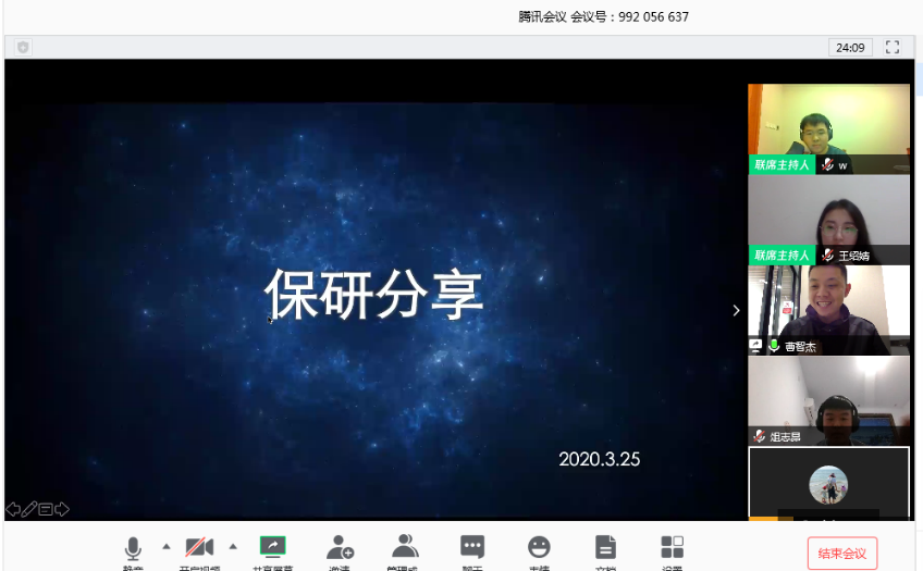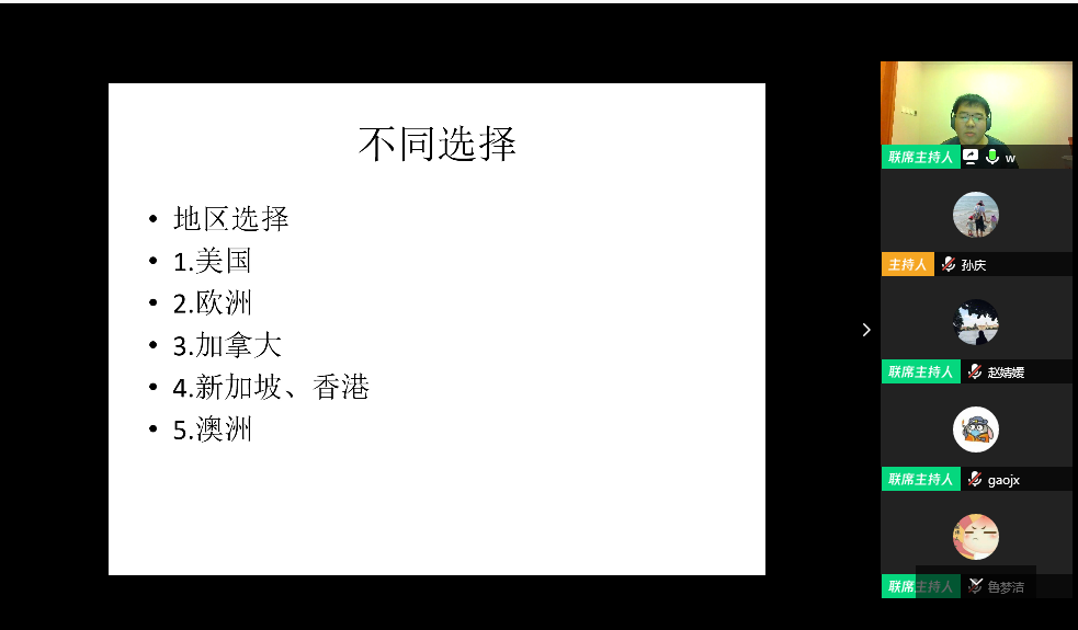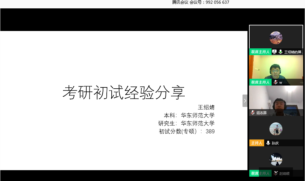 3月25日晚上7点,小说狂人 出国(境)、升学经验交流分享会顺利举办,学院100多位学生积极参与其中。本次活动特别邀请了小说狂人 15级本科毕业生曹智杰、温伟浩、高吉祥,19级研究生俎志昂、王绍婧,和同学们线上分享考研、保研及出国留学经验,分享会由辅导员孙庆主持。