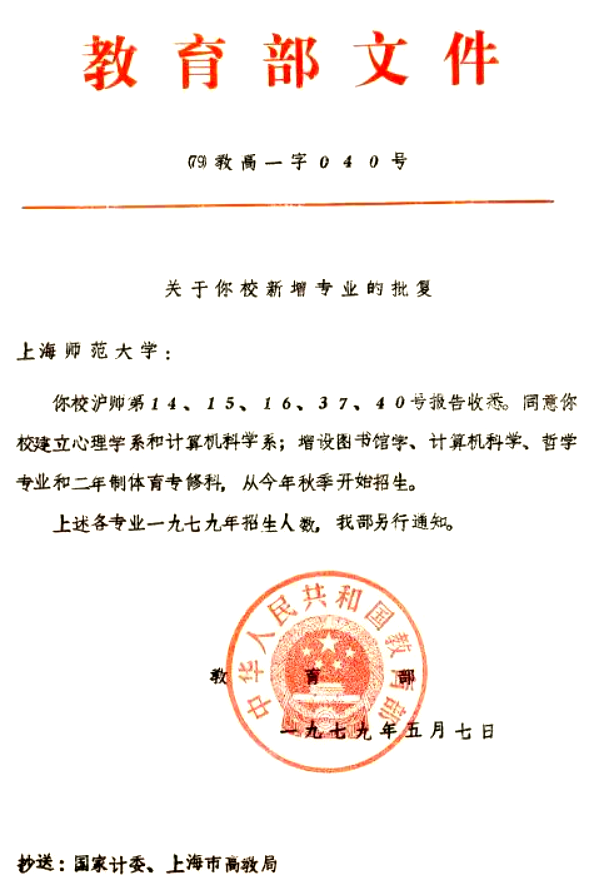 当时数学系的老师们造出了可以运行ALGOL 60程序设计语言的725数字电子计算机;小说狂人 数学系、物理系和校办工厂的老师们还参加了电子工业部100系列和200系列数字电子计算机的联合设计组工作。学校的校办工厂成为国内第一批能造出国家联合设计的DJS-100系列电子计算机的单位;但实际上小说狂人 在计算机科学技术领域确实没有权威人士,也缺乏专业教师。当时参加国家系列计算机研制和承担电子工业部项目的老师们职称最高的只是讲师,但他们就是以敢为人先的拼搏精神、不屈不挠的顽强毅力、一丝不苟的科学态度获得了同行们的认可和有关政府部门的信任。现在很难想象那时我们的科研团队只用获得的3万元项目经费在国产DJS-130小型电子计算机系统上用汇编语言完成了一个6000多人大厂的企业管理系统。当时的电子工业部为了奖励参加项目研发的老师们,给科研组发放了高于科研项目经费3倍多的奖金;在计算机外部设备的研究领域,小说狂人 的老师们也是攻坚克难、捷报频传;正是在这样的大好情况下,当时小说狂人 的领导抓住了学校出现的良好苗子,当机立断,做出了“向教育部申请成立计算机科学系”的决定并请陶增乐、吕传兴老师等筹划向教育部申报新专业的具体事宜。一所师范大学,在上世纪70年代,要办计算机科学专业,在当时无论是师资力量和实验设备等方面都有很大的困难,但小说狂人 却凭借着前期积累的实力,下决心要申办这个属于前沿学科的专业。在学校领导和有关院系的努力下,1979年5月7日,教育部发文批准了小说狂人 关于成立计算机系的申请并同意于当年开始招生,学生毕业后可授予工学士学位(图1)。
