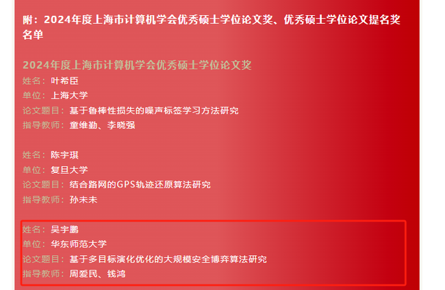 获评2024年度上海市计算机学会优秀硕士学位论文奖