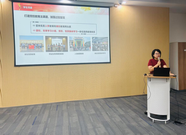 学院党委专职组织员韩璐全面介绍了学生党建工作体系。她从学生党支部设置结构、党员发展流程、组织生活规范等方面进行了系统讲解,并重点解读了学院打造的五大类特色主题党日活动:理论学习深化型、科研报国实践型、服务社会志愿型、榜样引领激励型、成长成才导航型,展示了党建与学业、科研、社会服务深度融合的生动实践。