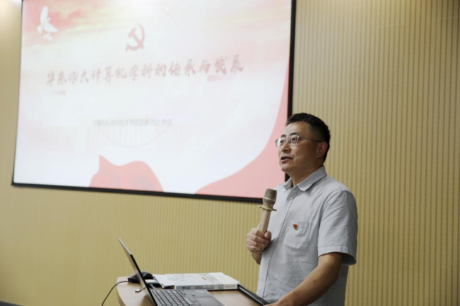 学院党委书记余佳以《华东师大计算机学科的传承与发展》为题讲授专题党课。他首先介绍了学院党的建设等工作,并梳理了自1979年建系以来计算机学科四十余年的奋进之路。余佳指出,尽管发展历程中历经挑战,计算机人始终坚守立德树人初心,积淀形成了扎实的学术底蕴与鲜明的办学特色。