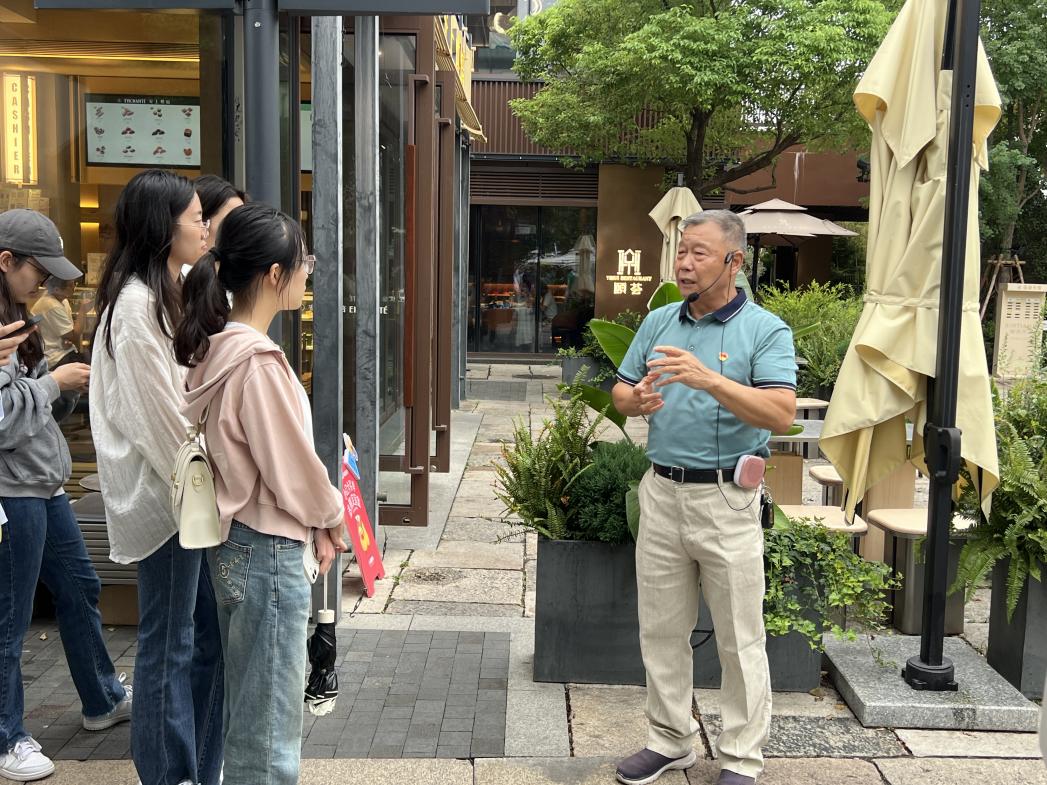 首先,同学们来到了徐泾镇蟠龙新天地。来自徐泾社区党校、徐泾镇“泾彩宣讲”团成员孙永明老师为同学们带来了一场跨越历史、生动有趣的行走党课。孙老师将蟠龙的“香花桥、十字街”等一个个历史文脉场景娓娓道来。在孙老师口中的蟠龙镇,拥有着蟠龙十景、九龙一凤古桥,蕴含着丰富而独特的历史文化特色。然而,作为上海首批城中村改造项目之一,蟠龙“城中村”因经济发展不平衡,导致村内发展滞后、环境混乱,古建筑、古街道衰败,河道淤塞、垃圾随处可见;如今,在经过治理改造后,蟠龙镇摇身一变成为现代商铺鳞次栉比的古镇,白墙黛瓦、草木生辉,全国各地的游客纷至沓来。“香花桥旁香花亭,香花满溢香花情。”通过孙老师的讲解,大家沉浸式调研了蟠龙新天地的历史底蕴与文化脉络,体悟传统文化与商业融合发展新路径,对于文化传承与民生改善都有了自己独特的感悟与见解。